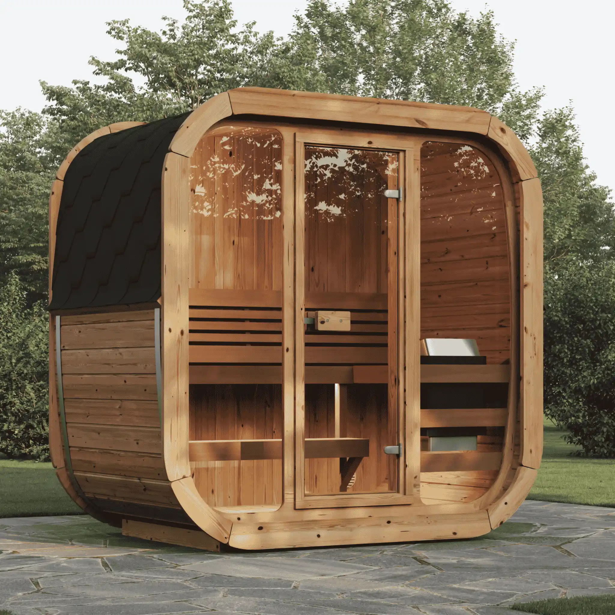 Combina diseño moderno y funcionalidad en un formato compacto y elegante. Ideal para jardines pequeños, ofrece una experiencia premium para hasta 3 personas, con calentamiento rápido y acabados en abeto nórdico y cristal templado.